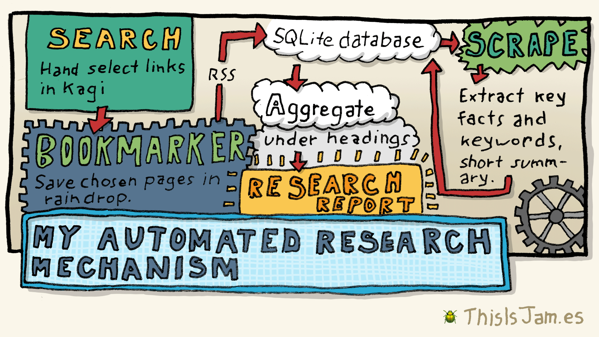 I’ll do various searches on Kagi on a topic, then open any links I think look interesting in new browser tabs. Then I’ll quickly go through all those tabs, and if the article looks good, I’ll save it in my bookmark manager.