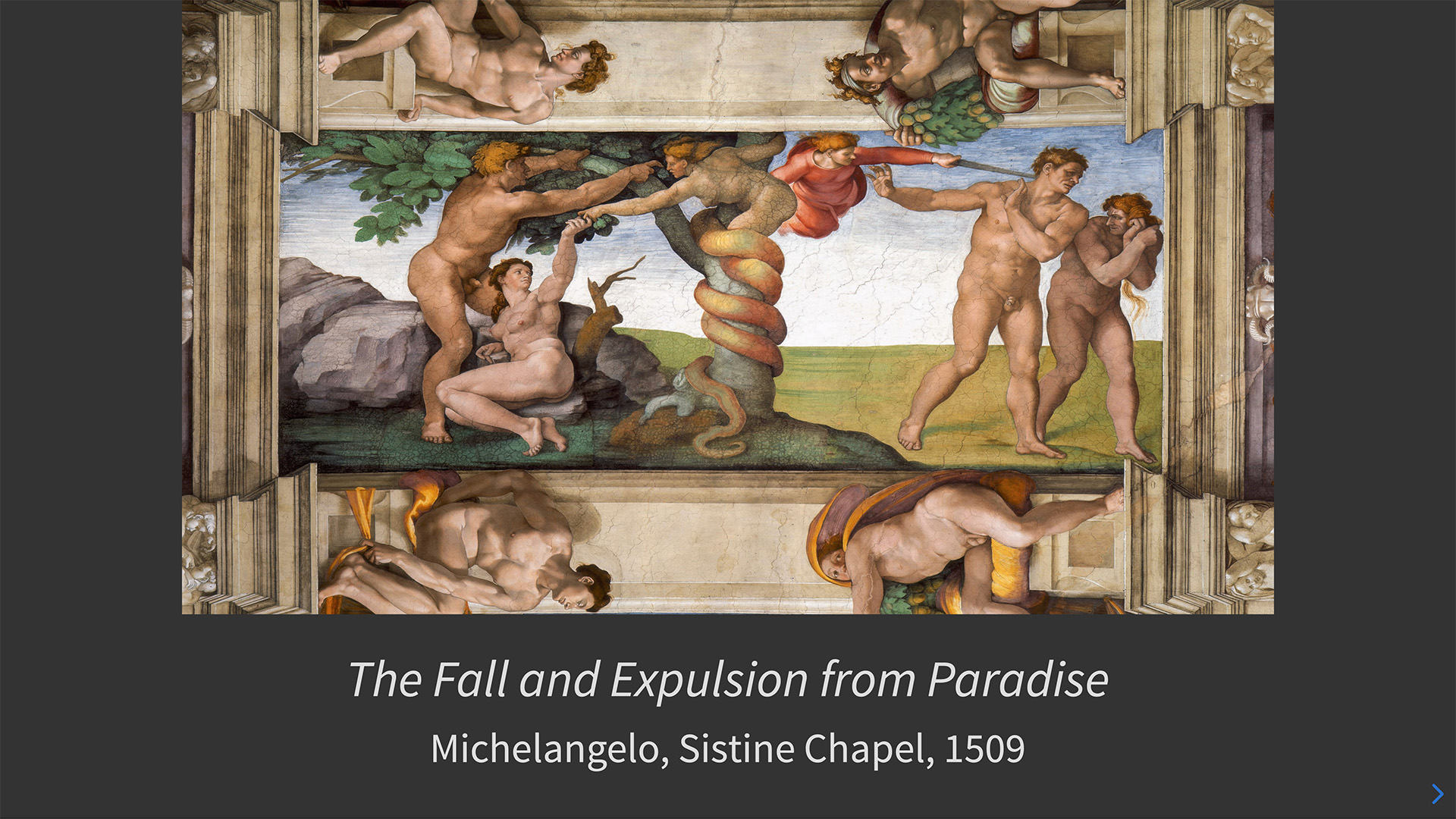 * The image is displayed full-screen. I want to add a picture title, artist and date to this, and make it so that the picture becomes full screen on the next slide. How should I do that using the Revealjs auto animation mechanism? It’s fairly easy. Here’s what the relevant bit of code looks like: