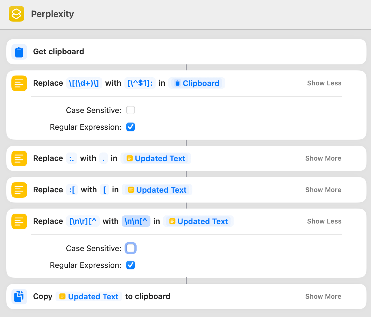 Perplexity.ai is pretty good for learning new scientific concepts. It provides references for all it’s assertions, making it more reliable (or at least easier to fact-check) than responses from ChatGPT. If you copy a response from Perplexity.ai, it is in Markdown format (hurray!), but uses a non-standard format for footnotes (boo!), which works neither in Bear (my note taking app of choice), nor Quarto (which I use to maintain this website). I want the methods I use to copy and paste stuff to be as easy as possible, so I decided to create a OSX Shortcut to make the necessary adjustments to the Perplexity output. Here it is: