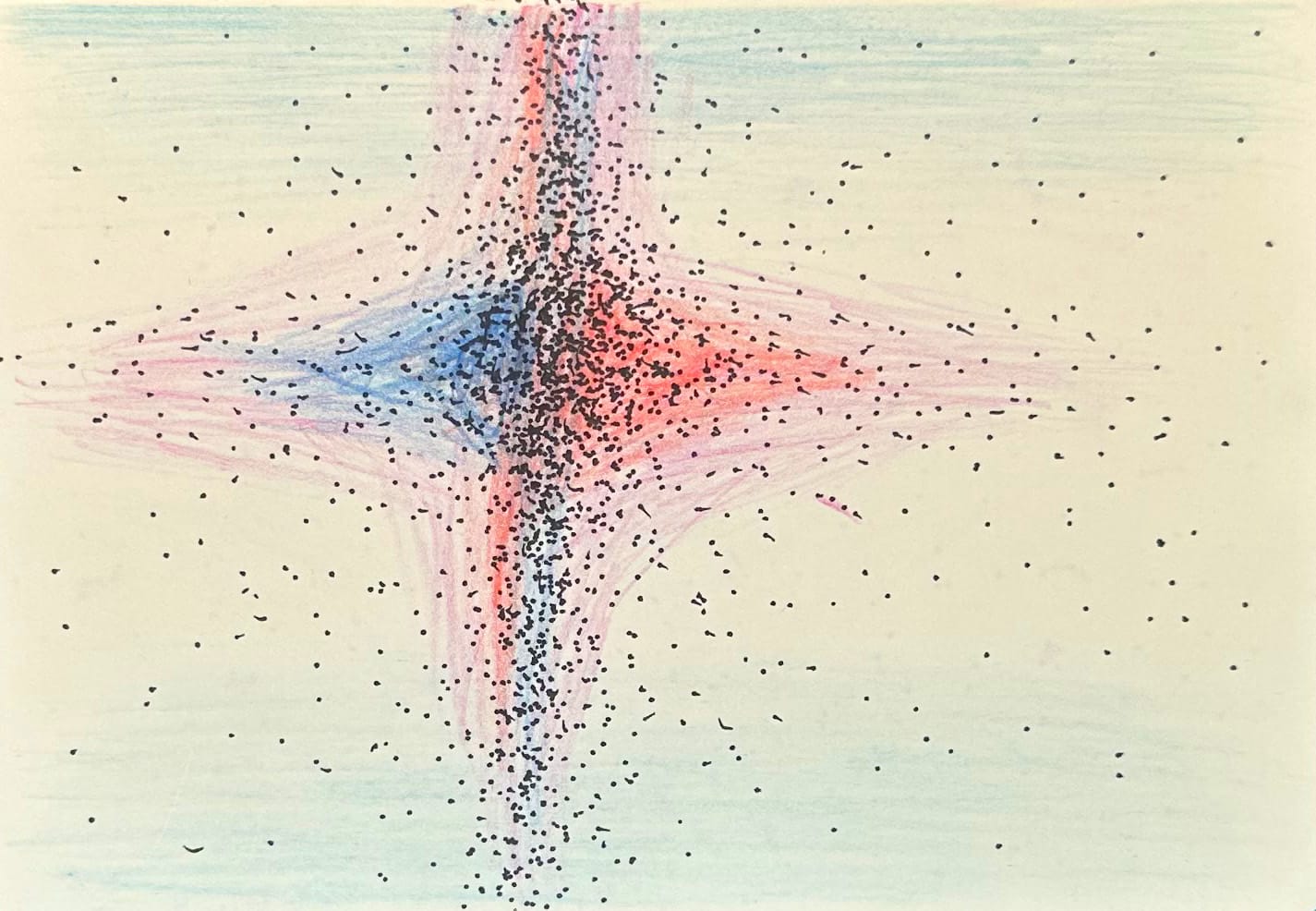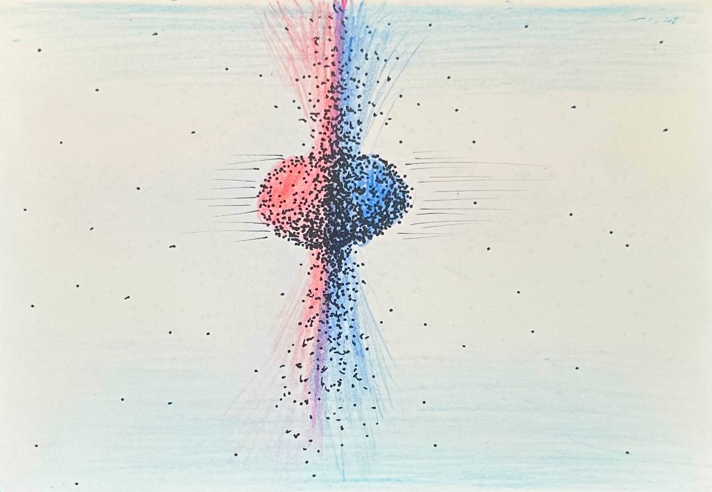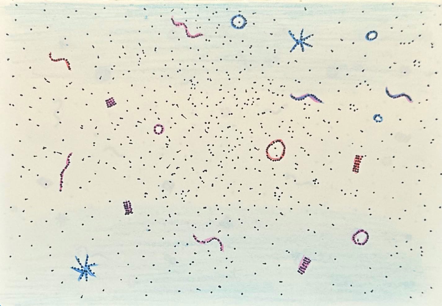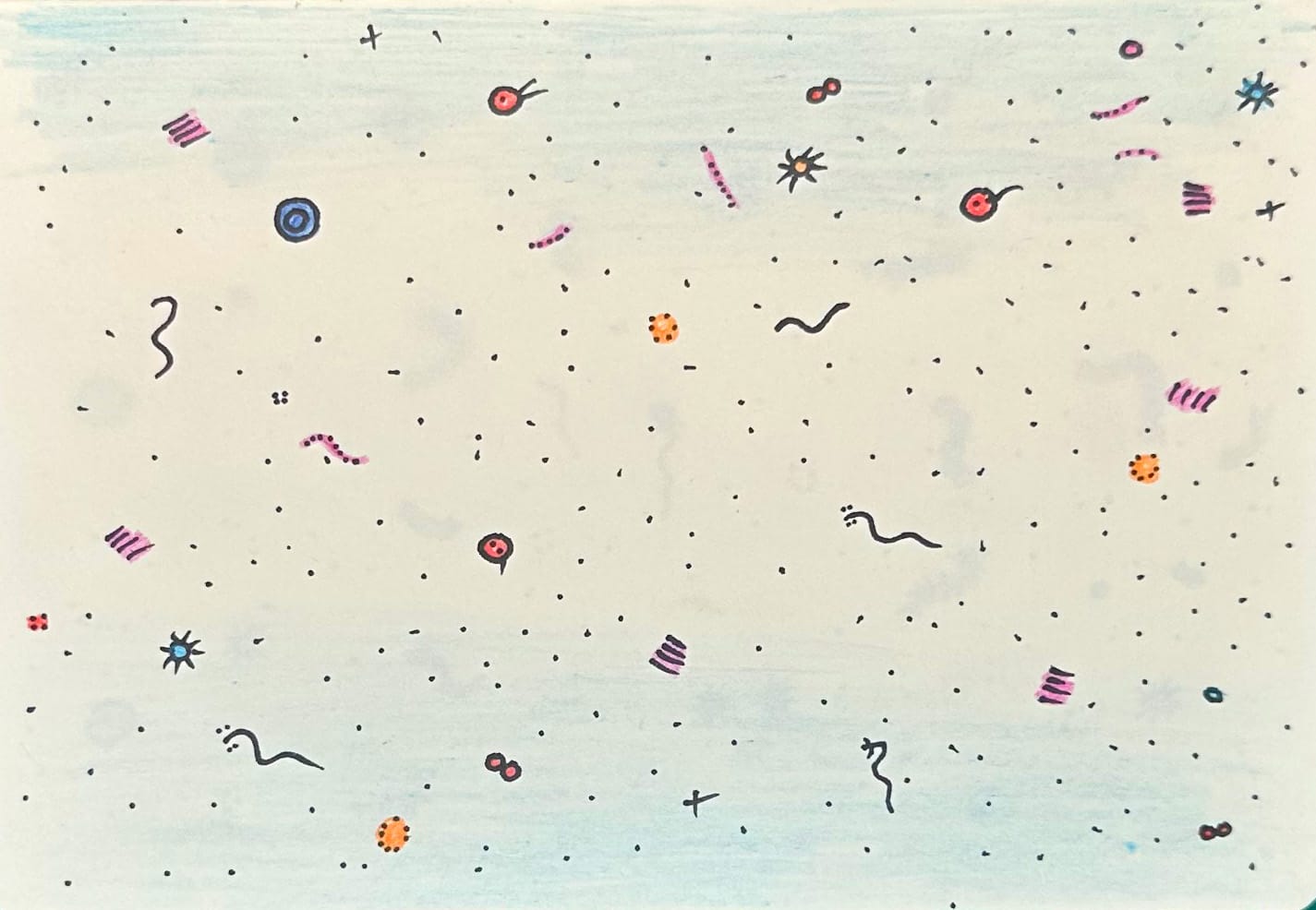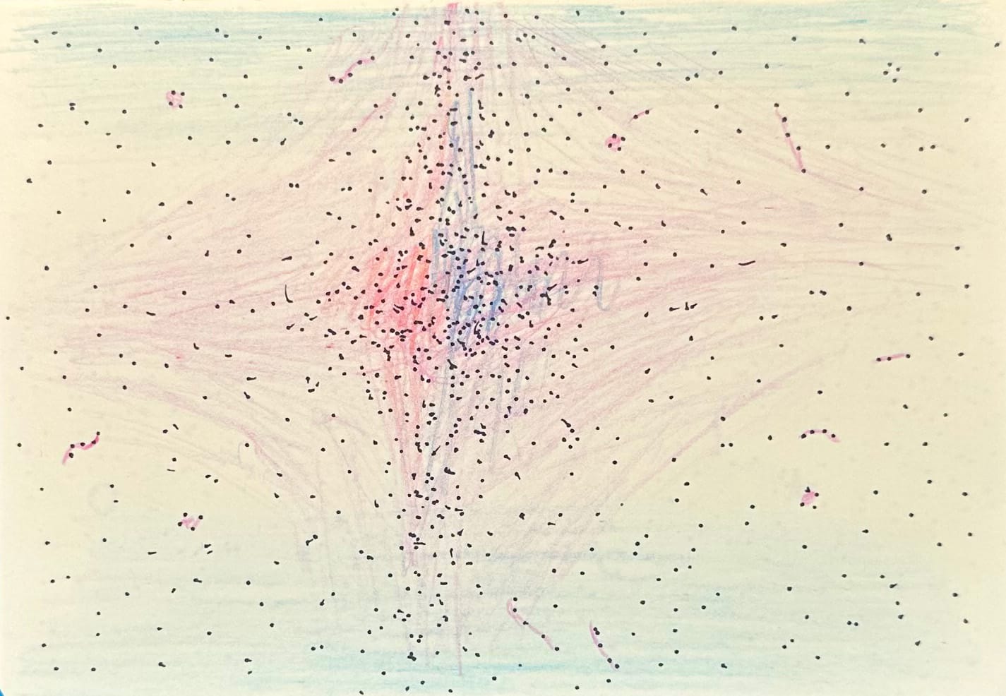 Some little drawings I did around the concept of abiogenesis, using a fiber-tip pen and coloured pencils.