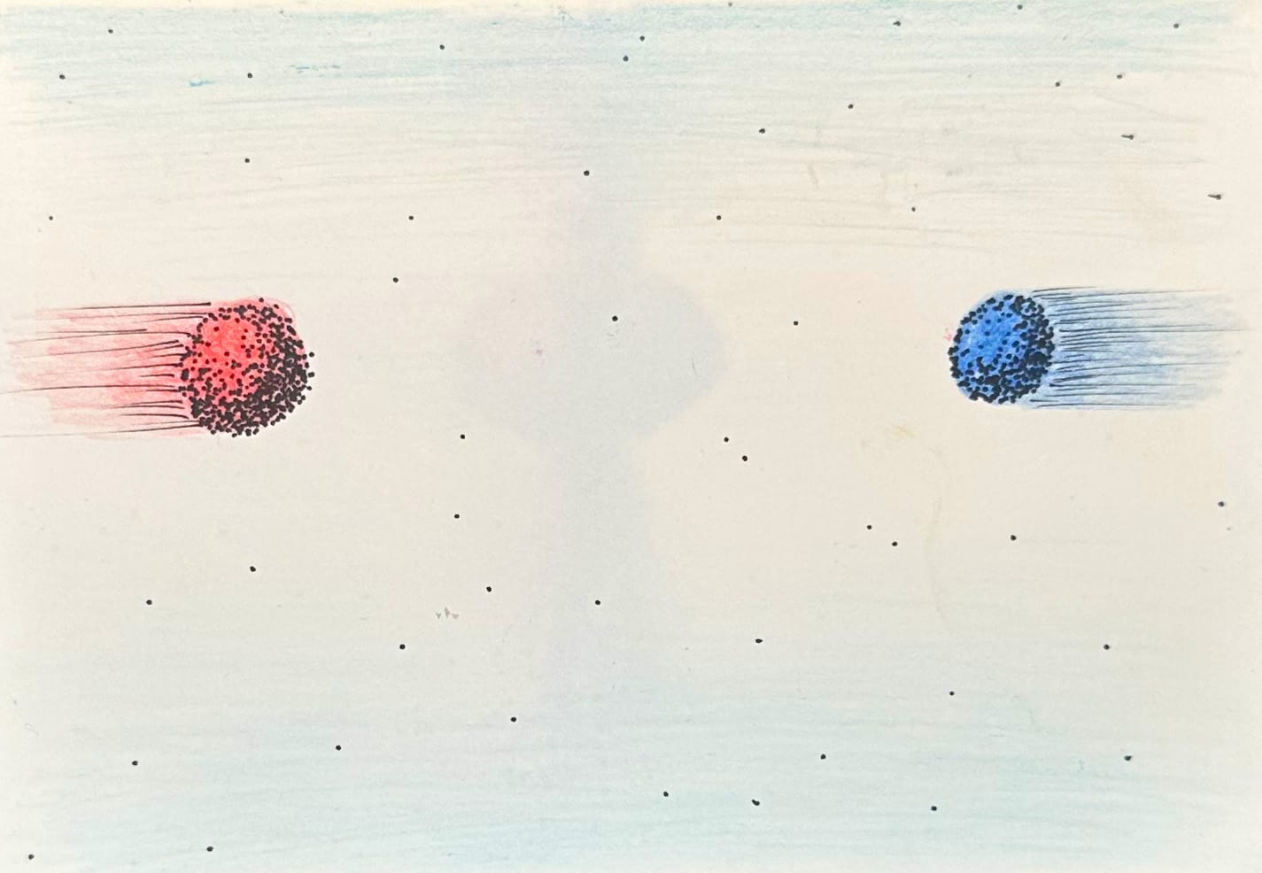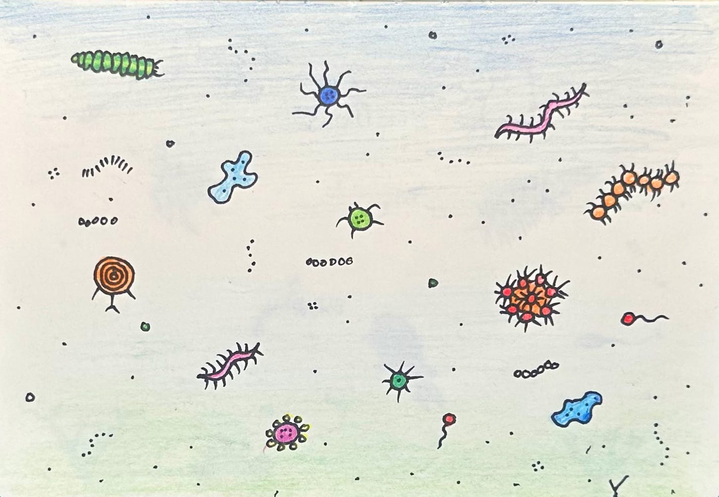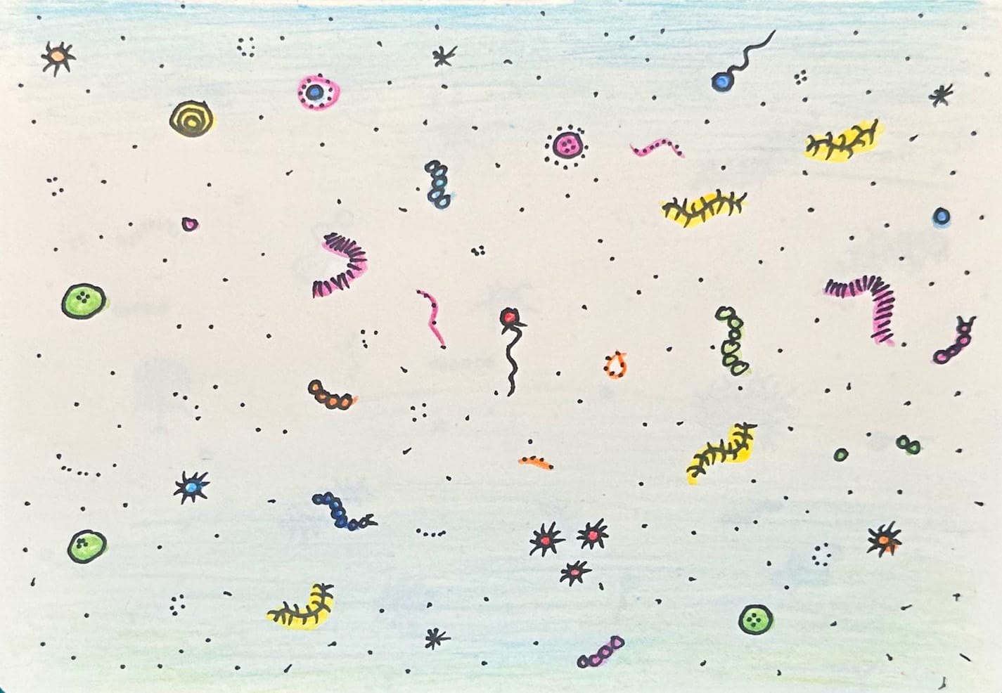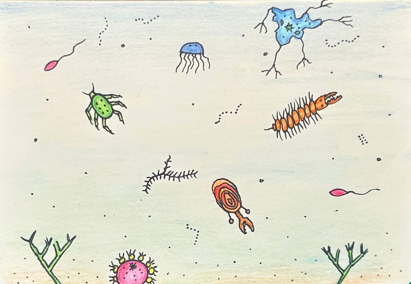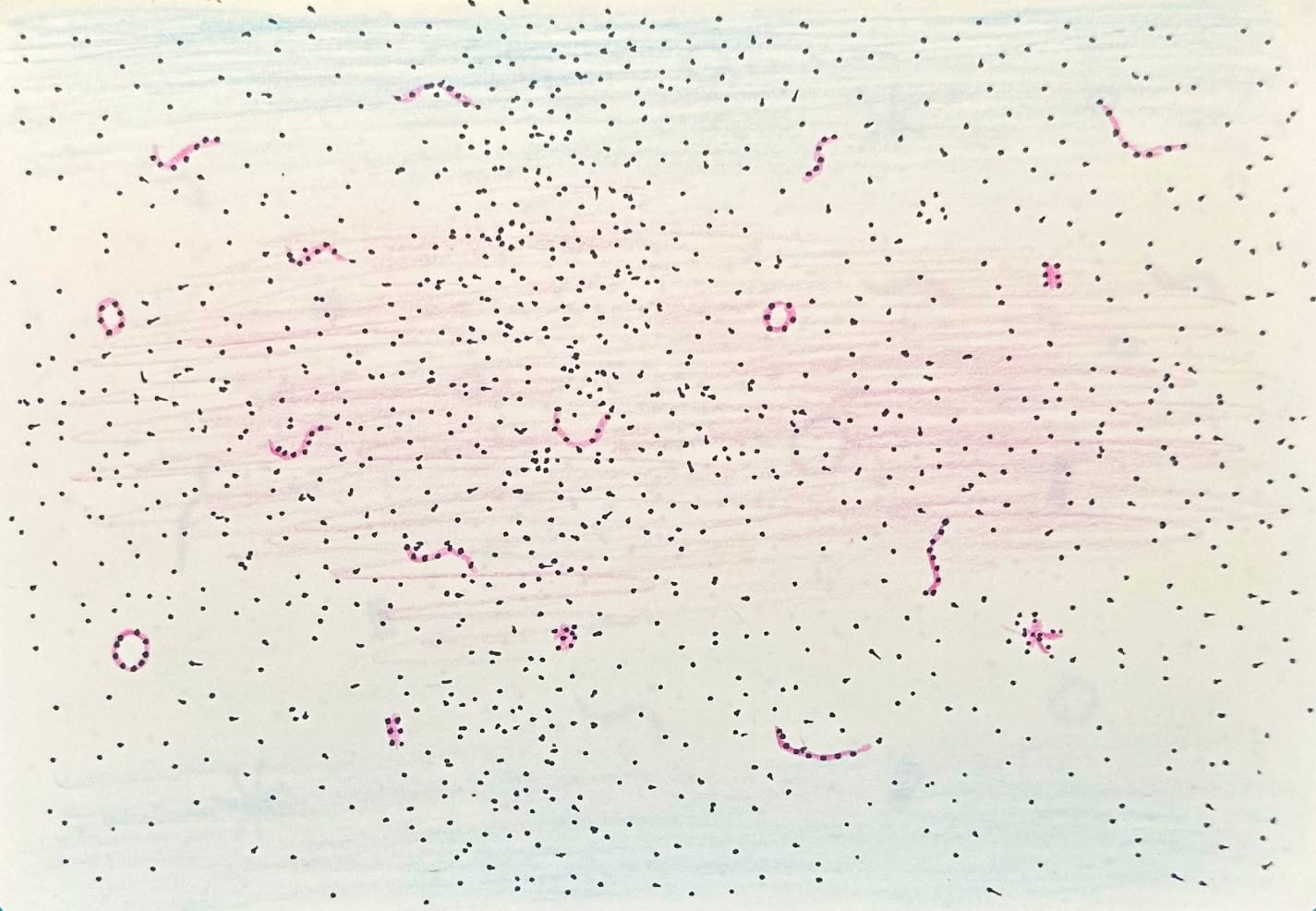 Some little drawings I did around the concept of abiogenesis, using a fiber-tip pen and coloured pencils.