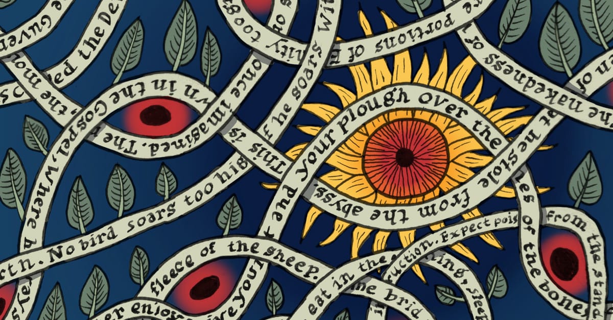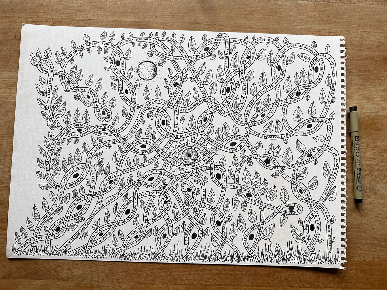 I started this image many months ago. The inspiration for this work comes from many sources, including Italian Renaissance magic and William Blake. I inked the stems and leaves using black Micron fiber tip pens on A3 watercolor paper. Recently, I’ve been learning how to use a calligraphic fountain pen (a Lamy Joy) and realized that incorporating text on the stems might look appealing. Consequently, I wrote out excerpts from The Marriage of Heaven and Hell by William Blake on the stems1. Initially, I hadn’t planned the stems with this purpose in mind, resulting in varying thicknesses, which is not ideal. However, I appreciate the effect and plan to explore this technique further in future works, possibly with ropes or vines of text. Here’s the final inking: