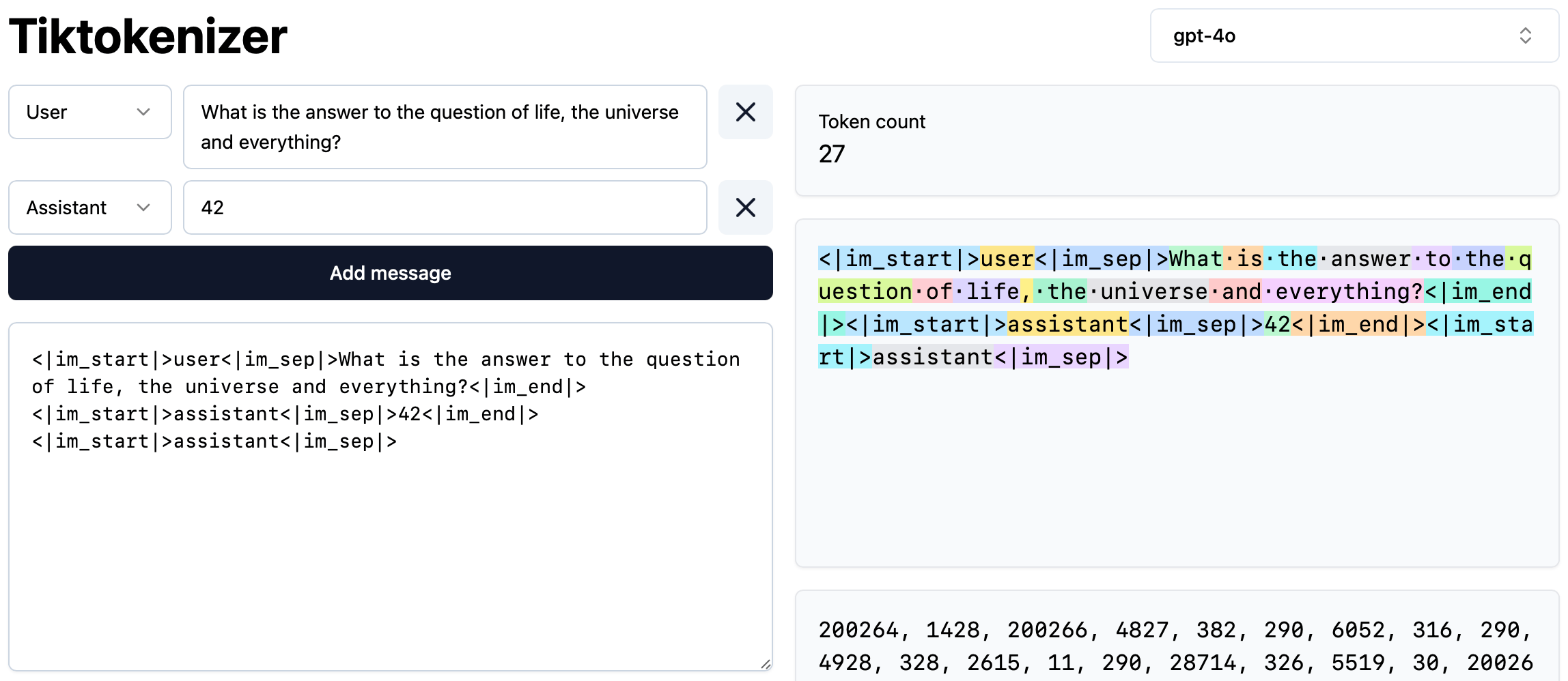 - Give give it a token, and it responds with a token randomly, but with the probabilities weighted, so some responses are more probable than others.