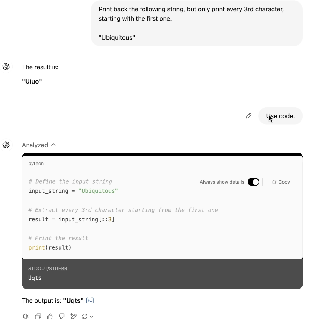 - They are not good at spelling. They don’t see letters, they see tokens, which can be multiple letters. So if you ask it to e.g. print every third character, it will screw up.