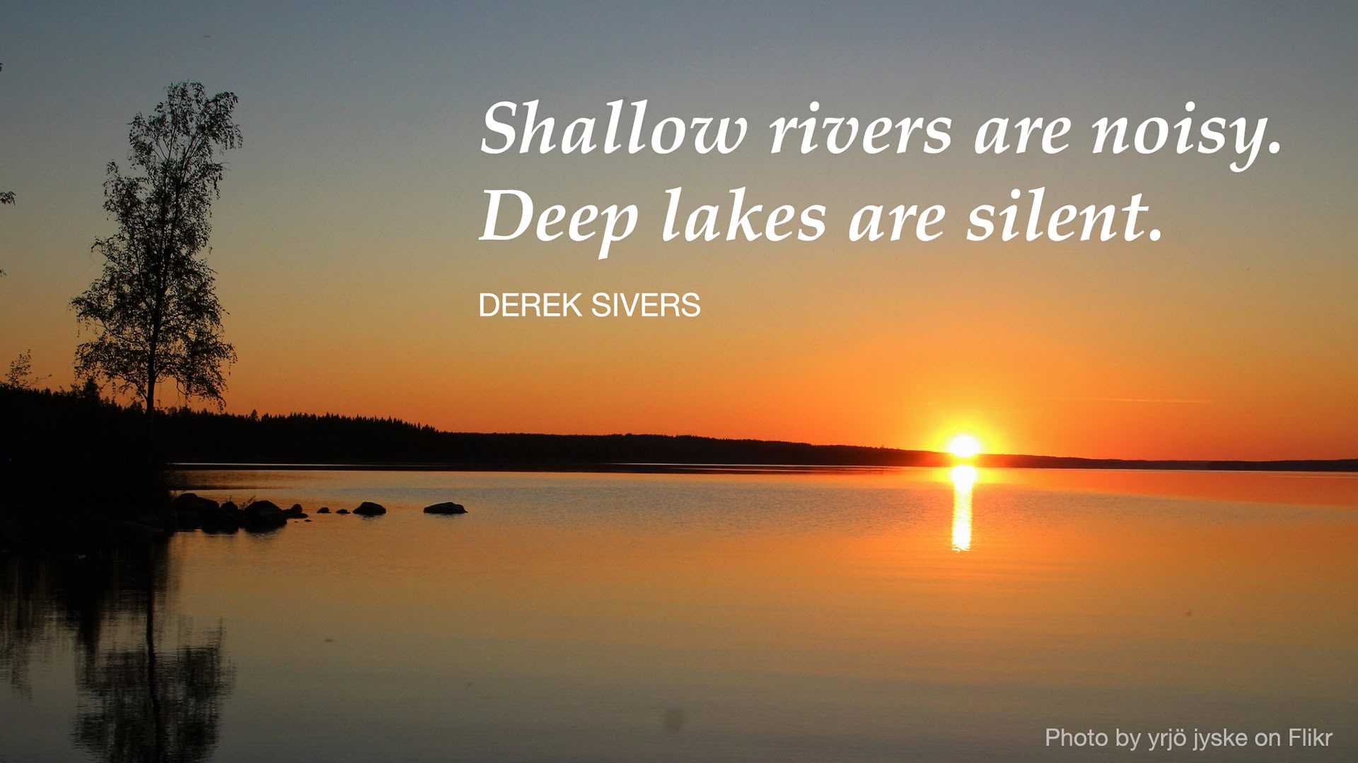I guess I shouldn’t have taken the title so literally. How to Live sounds like it is going to have some profound insights into the nature and meaning of life. But it doesn’t have that. This is a shallow book. In fact it isn’t really a book, it’s more of a list. A list of little deepities1. The kind of statements you’ll find on an instagram feed, or you used to see on motivation posters in dull offices. If you like pictures of sunsets with cheesy quotes on them, this book is for you. In fact, let’s try that with one of the statements from this book. First I need a peaceful image of a still lake at sunset with an attribution license. Here you go. Now let’s add some text from Siver’s book. Tada: